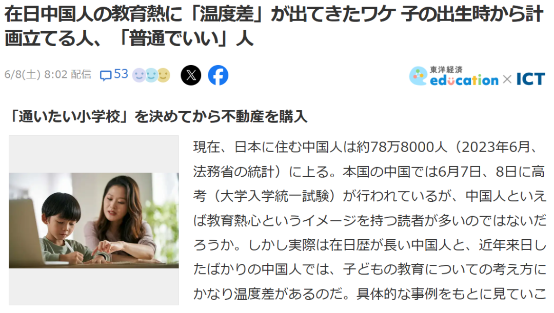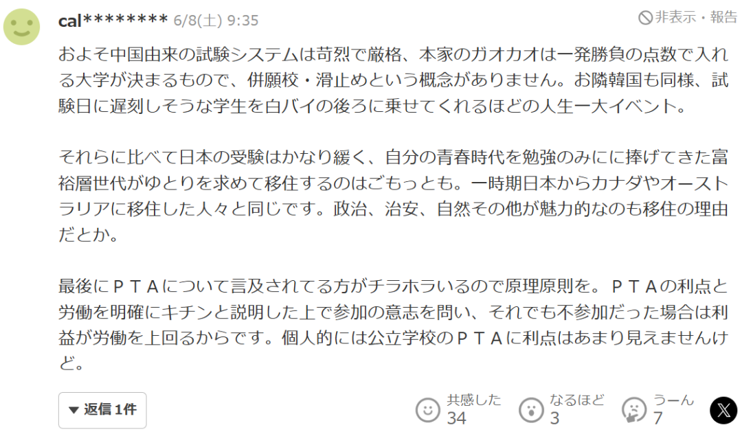 源頭是因為中國的考試製度是苛刻而嚴格的,原本高考是以一次性成績分數來決定你能被哪所大學錄取,沒有平行學校的概念。鄰國韓國也一樣,考試日可能遲到的學生會坐上白色摩托車被護送到考場,這也是他們的一件人生大事。與之相比,日本的考試相當寬鬆。那些把青春全部獻給學習的富裕階層,為了獲得更寬裕的生活而遷移,這是很合理的。與從日本移居到加拿大和澳大利亞的人一樣。政治、治安、自然等等的魅力也是移民的原因。最後有幾個人提到PTA時比較誇張,我認為因為在明確説明PTA的好處和勞動之後,詢問參加的意願,如果還是不參加的話,那就得不償失了。就我個人而言,公立學校的PTA並沒有多少優勢。