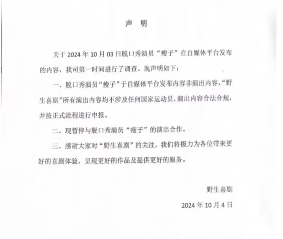 另有數日前,脱口秀演員因在表演中用運動員成績造梗被粉絲聲討,事態發酵後,廣州野生喜劇脱口秀很快發聲明宣佈與演員暫停合作,一套「連招」下來十分絲滑。