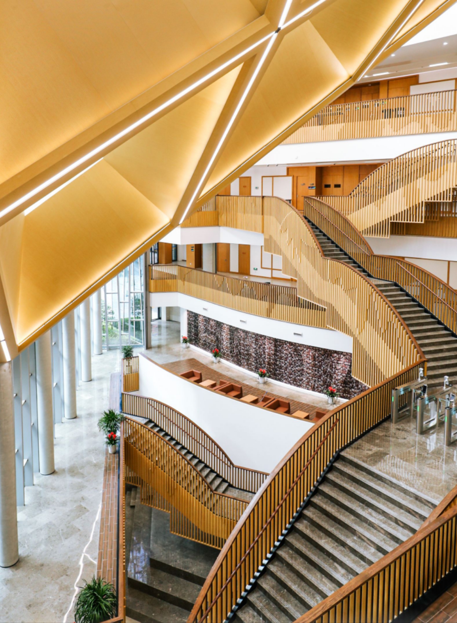 比如院長詳細介紹了這棟樓,從前期在全球各地交流和調研尋找設計靈感,到全球甄選設計事務所,從整體佈局到細節構造(比如外立面的陶土管,如下圖),從功能設定到目標產出(比如劇院計劃一年要播放200場劇,向市民開放),不一而足。能看出院長的用心:想要打造中國人自己的管院,從靈魂到實體。大學是用來幹嘛的?是否就是給學生提供學習知識的場所?**打造“大學的社區”。院長説招生不想招媽寶,更不想培養媽寶。所以,新院區造出來,希望給學生提供多元體驗,爭取做到“全人教育”(whole-person education)。**我想,要成之為完整的人,尤其在鋼筋水泥的叢林裏,需要培養生存能力(買菜做飯)、社交能力(跟人聊天而不是跟ChatBot聊天機器人)、共情能力(體味勞動人民的疾苦和戰爭難民的悲痛)以及審美能力。**建立“社區的大學”,二來給大學所在的社區和居民提供市民生活的場所。**我認為,管理是科學,但如果脱離了人民羣眾就不是科學。所以承載管理科學理論和實踐孵化的這個院子,也應該是接地氣的。因此學校的門不能緊閉,圍牆不能高企。