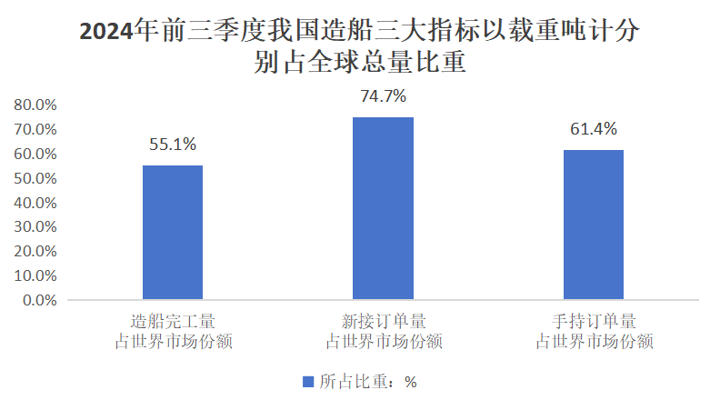 2024年前三季度我國造船三大指標以載重噸計分別佔全球總量比重