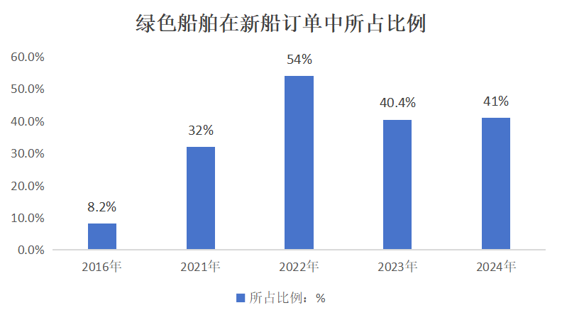近年來,綠色船舶在新船訂單中所佔比例一路攀升,從2016年的8.2%上漲到今年的41%。