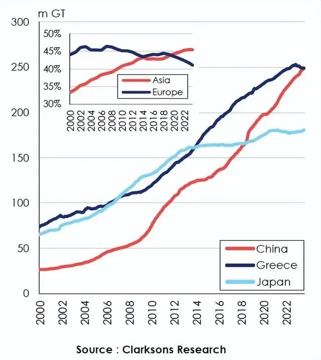 克拉克森數據顯示,按總噸位計算,2023年8月,中國超過希臘成為世界最大船東國,所持有船隊規模達到2.492億總噸,船隊價值達到1800億美元。