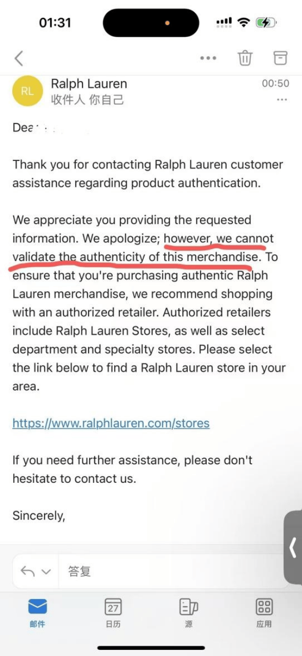 為了維權,卡卡聯繫了拉夫勞倫美國官網的客服,對方郵件回覆稱“we cannot validate the authenticity of this merchandise(我們無法驗證此商品的真實性)”。