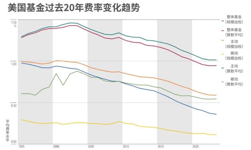 過去20年,美國基金行業持續降低費率。2004-2023年間,美國基金的資產加權平均綜合費率從0.87%降至0.36%,為美國投資者節省了數十億美元。