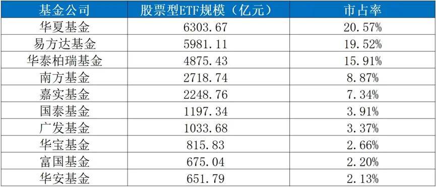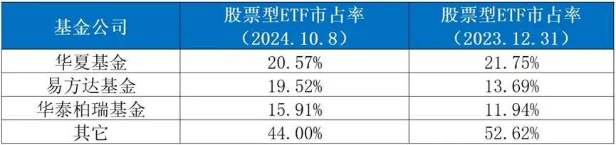 Wind數據顯示,截至10月8日,華夏基金、易方達基金、華泰柏瑞基金三家公募的股票型ETF規模分別達到6303.67億元、5981.11億元、4875.43億元,對應市佔率分別為20.57%、19.52%、15.91%,排名前三。