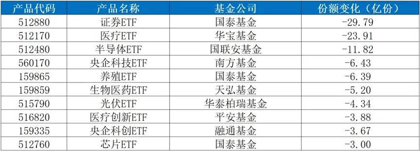 整體來看,證券、醫藥、科技等板塊贖回現象最為明顯。Wind數據顯示,“924”政策前夜至國慶節後第一個交易日,國泰基金的證券ETF、華寶基金的醫療ETF、國聯安基金的半導體ETF淨贖回居前,分別達到29.79億份、23.91億份、11.82億份。