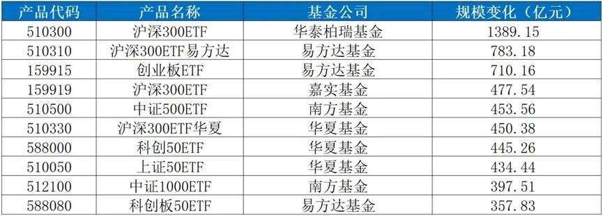 期間,寬基ETF更是跑出“加速度”。其中,華泰柏瑞基金的滬深300ETF、易方達基金的滬深300ETF和創業板ETF產品規模,分別增長了1289.15億元、783.18億元和710.16億元,排名靠前。