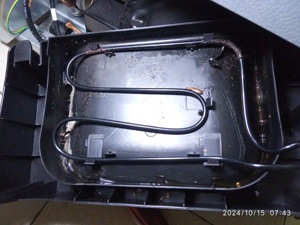 “二半吊子”設計:這個冷凝水儲水盒裏面有製冷管還是鐵質的材料,並且和冷凝水區一個位置,所以管路不鏽蝕漏光冷液就奇怪了