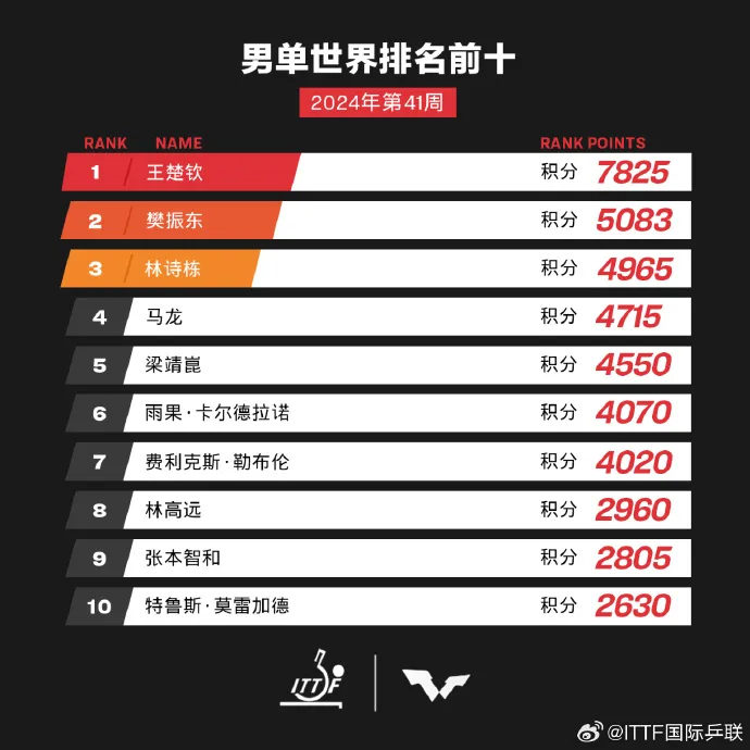 根據國際乒聯10月8日發佈的2024年第41周世界排名,王楚欽積分7825,排名世界第一,比新科奧運冠軍和大滿貫樊振東的5083高出近3000分。