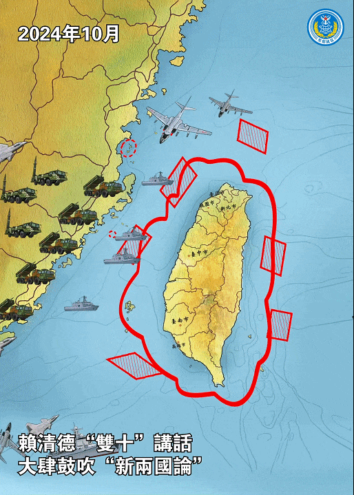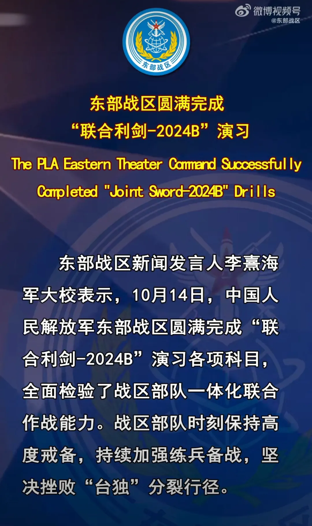 2024年10月14日拂曉,中國人民解放軍東部戰區陸海空火諸軍種兵力,從多個方向對台灣本島,展開戰役佈勢,代號為聯合利劍-2024B的聯合軍事演習正式打響。
