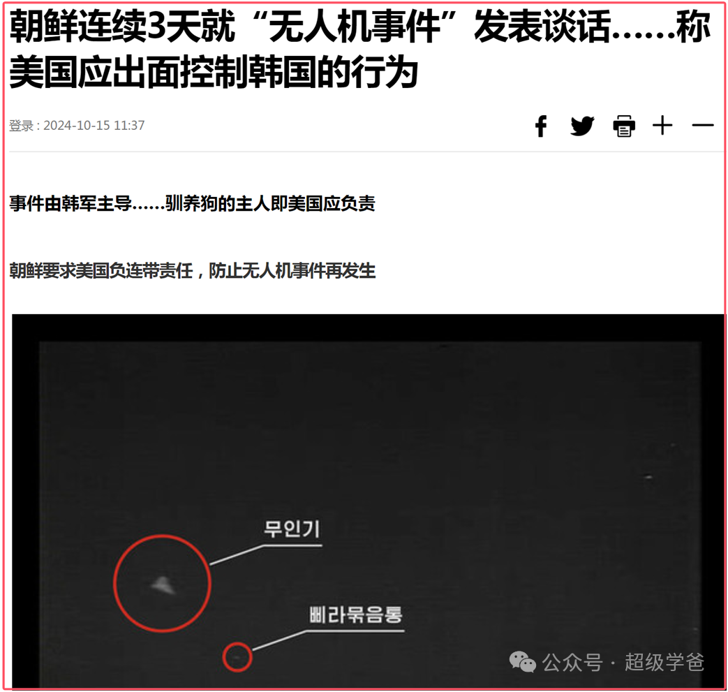 這時,我認為朝鮮的態度還是比較剋制的,畢竟反制的方法不多。但是朝鮮還是抓住了問題的根本,那就是直接喊話阿米利卡,管管自己的狗。(要求美國防止無人機事件再發生)。