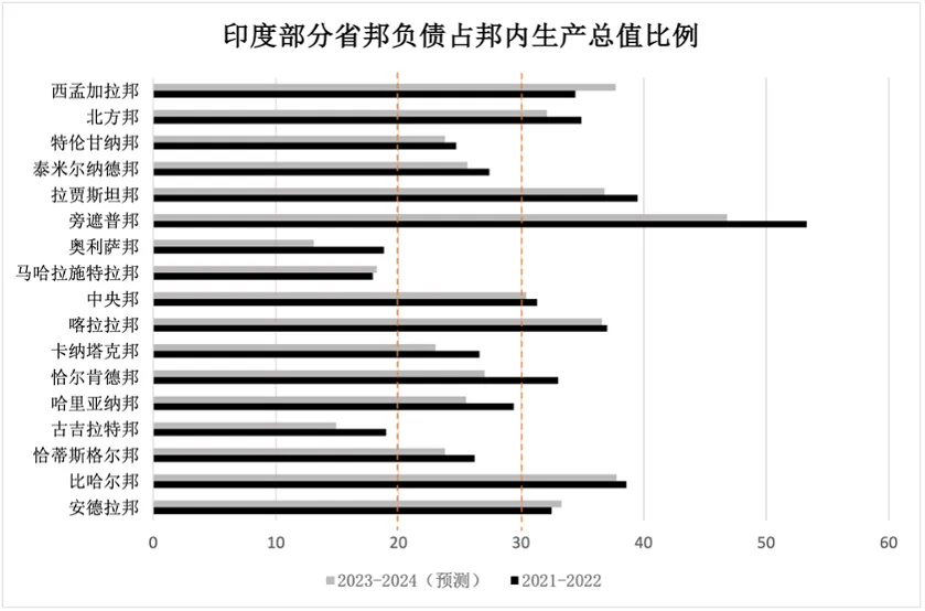 印度部分省邦負債佔邦內生產總值比例,資料來源:RBI Bulletin、Forbes India,原網址分別為:https://rbi.org.in/scripts/BS_ViewBulletin.aspx/; https://www.forbesindia.com/article/explainers/debt-to-gdp-ratio-indian-states/88469/1. 圖源:”南亞觀察”微信公眾號