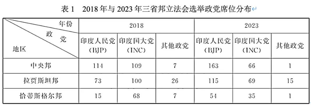 為了進一步説明新晉中產因損失厭惡做出的政治選擇對選舉政治的直接影響,筆者將 2019、2024年兩屆大選前印人黨在中央邦、拉賈斯坦邦和恰蒂斯格爾邦三地立法會選舉的表現及其緣由 進行比較分析。選擇這三邦進行分析的原因為: 一是 這三個邦的立法會選舉既是次年大選前最後的也是最重要的地方邦選舉,也是回顧執政黨政府上一任期表現的絕佳觀測時間點; 二是 這三個邦所在地區位於印地語中心地帶(hindi heartland),該區域傳統上被認為是印人黨穩固的支持者,他們的選擇一定程度上將作為次年大選的風向標; 三是 國大黨及重要的地方政黨在該地區的存在感強且爭奪意願十分強烈,選舉結果的不確定性較高。
