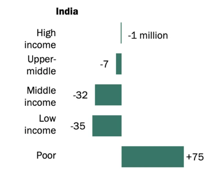 根據皮尤研究中心的調查研究顯示,新冠肺炎疫情期間印度有大量中產階級人口返貧。圖源:pewresearch.org