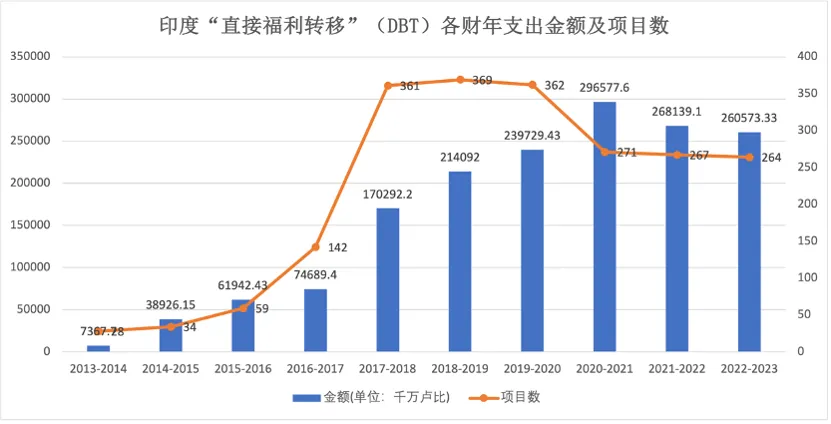 印度“直接福利轉移”(DBT)各財年支出金額與項目數,筆者根據印度農業和農民福利部網站 (https://dbtbharat.gov.in/) 資料整理。 圖源:”南亞觀察”微信公眾號