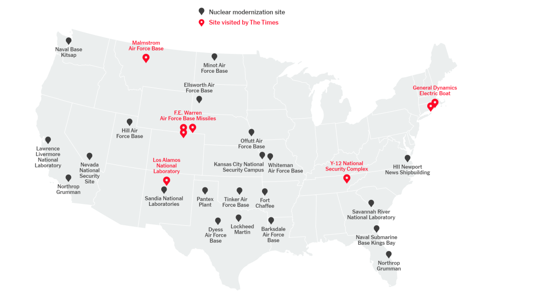 (上圖黑色小點為美國更新核武庫的地點,紅色小點為《紐約時報》記者實地採訪過的地點)