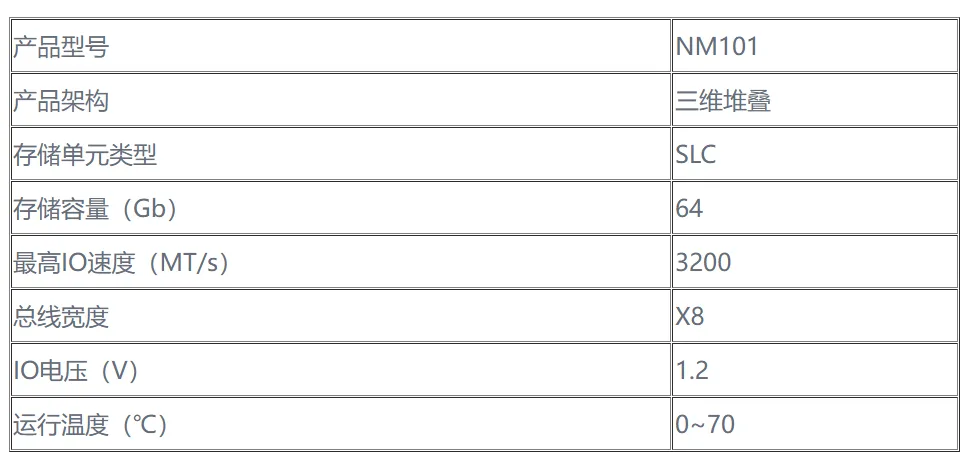新存科技官網公佈 NM101 芯片的參數顯示,NM101採用SLC存儲單元類型,最高IO速度3200MT/s,總線位寬為×8,IO電壓為1.2V,支持0℃~+70℃運行温度。