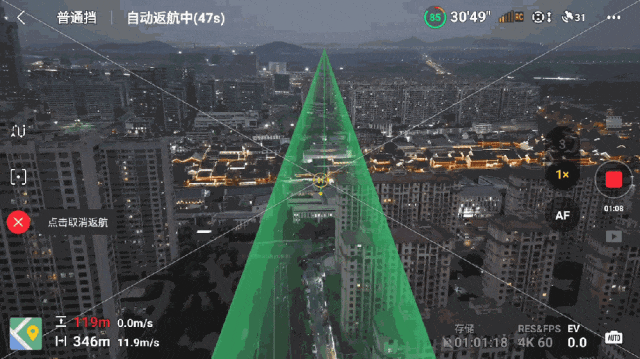 新一代智能返航讓 Air 3S 在沒有衞星信號的情況下,也能根據飛行軌跡智能規劃路徑實現返航,而且它還支持低光環境返航,我們通過圖傳,就能即時看到返航路徑: