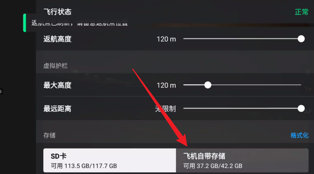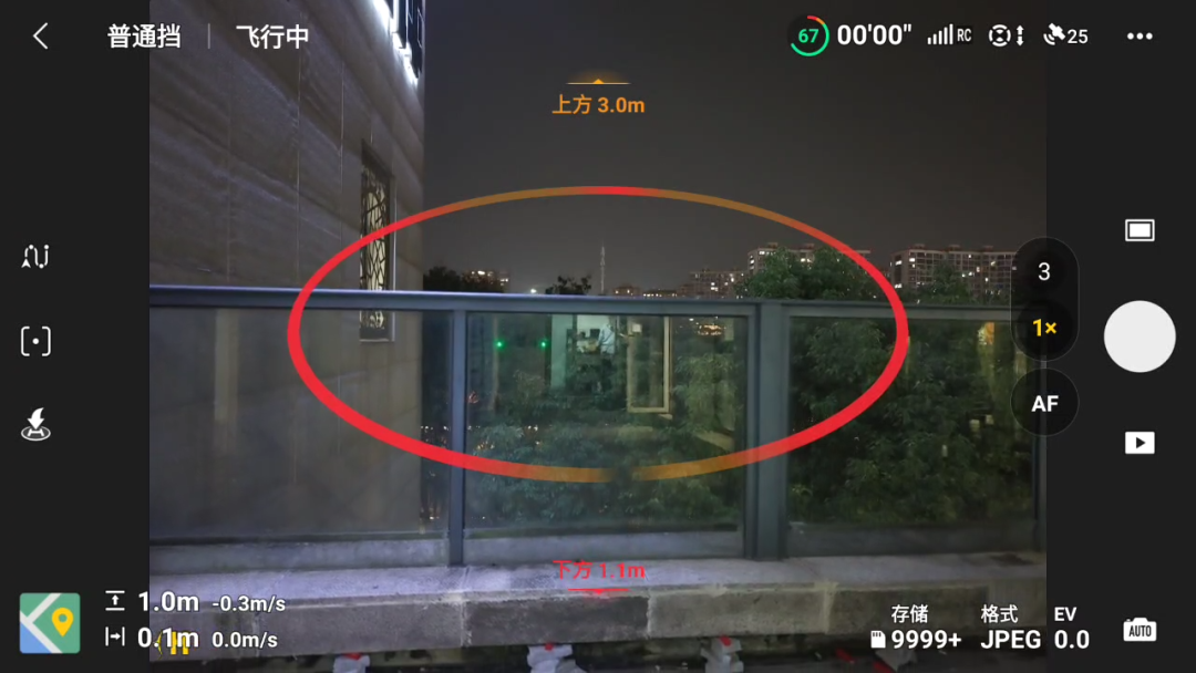 但如果換成 Air 3S,即便到了晚上,它的全向避障功能依舊可以正常工作,圖傳中間這一圈,代表無人機四周的障礙物,而上下障礙物則是直接通過數字來呈現。