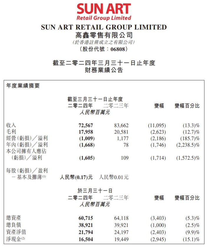 報告期內,高鑫零售關閉了20家大賣場。截至2024年3月底,公司擁有472家大賣場、32家中型超市以及3家M會員店。由於大規模的門店關閉,高鑫零售的員工人數也隨之大幅減少。公司員工數量從2023年3月底的107785人,減少至86226人,節省了超過5億元的僱員開支。截至今年3月末,公司的淨現金為165.04億元,相較於去年同期的194.49億元出現了明顯的下滑。