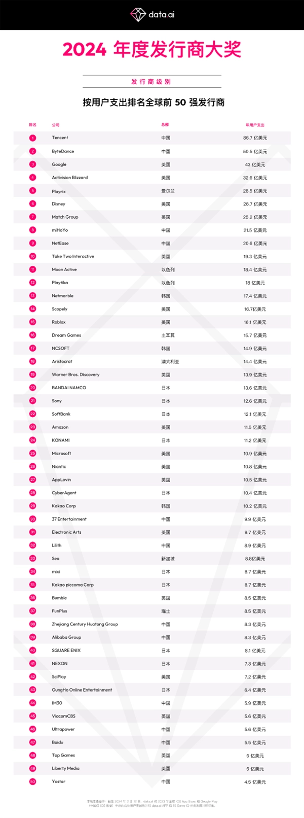 今天的中國遊戲市場足夠龐大,遊戲產業足夠發達,遊戲消費羣體足夠龐大。2023年上半年,我國遊戲市場的實際銷售收入達到了1442.63億元。2024年3月,全球年度發行商大獎列出了全球前50強發行商,其榜單統計對象包括2023年全球IOS和谷歌商店用户的支出。其中,前兩名分別是騰訊和字節跳動,對應的年用户支出分別為86.7億美元和50.5億美元;米哈遊首次進入Top 10並排在第8位,網易排名第9位。根據這個榜單,在全球前十的遊戲開發公司中,中國公司佔據了四席。