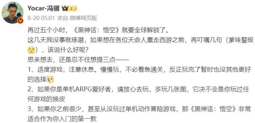 2024年8月20日,中國第一款3A遊戲《黑神話·悟空》上線前5個小時,製作人馮驥發了一條微博,提醒玩家要注意三點。不曾想,這會是一個瘋狂的開始。
