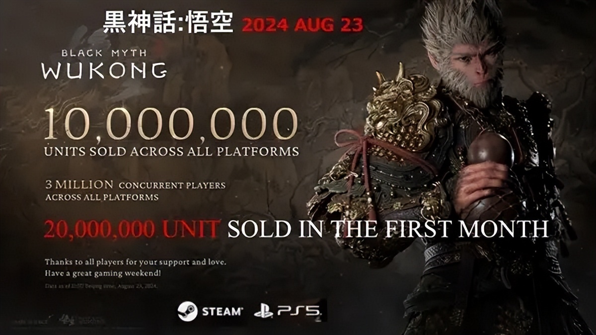 《黑神話·悟空》上線首日銷量突破450萬部,發售三天銷量突破1000萬部。根據綜合數據分析網站Gamalytic、遊戲市場調研機構VG Insights等第三方平台等最新數據,《黑神話·悟空》目前在Steam上的銷量已超過2100萬份,創造了中國3A遊戲的銷售紀錄,收入超過10億美元(約合人民幣70.8億元),而其開發成本為3億元人民幣左右。