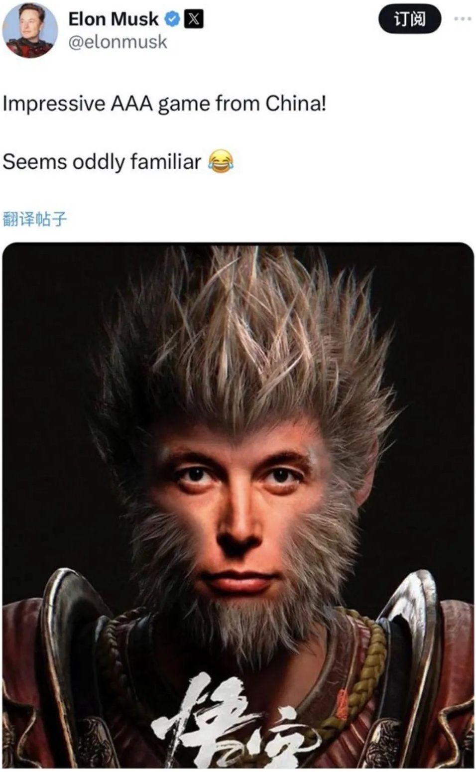 在海外遊戲市場,《黑神話·悟空》不僅吸引了眾多海外遊戲玩家下載,贏得了很多海外遊戲大V的鼎力推薦。美國企業家馬斯克也在玩《黑神話·悟空》,還在社交網絡分享了一張AI生成的遊戲海報圖,將遊戲主角“天命人”的臉換成了自己。