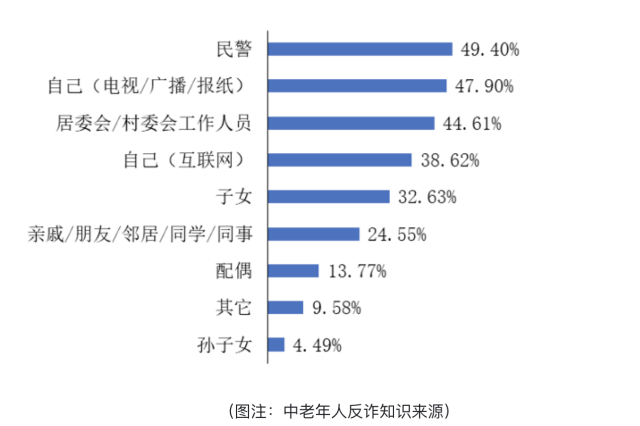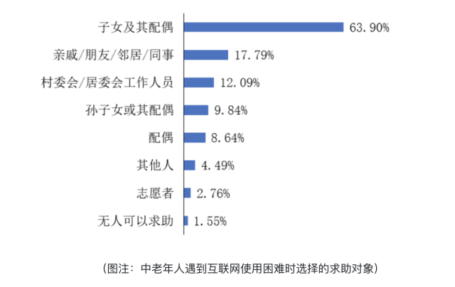 然而,調查發現,當遇到互聯網使用困難時,中老年人主要求助於家人親友,反詐知識的獲取也主要來自於民警、居委會/村委會工作人員**、**子女親朋等傳統渠道,中老年人線上學習仍有較大的拓展空間。其重要原因在於,現有適老數字技能、網絡安全知識等內容供給不足且渠道相對侷限,中老年人本身用網能力相對較低,想學但找不到、找到了但看不懂的情況較多。