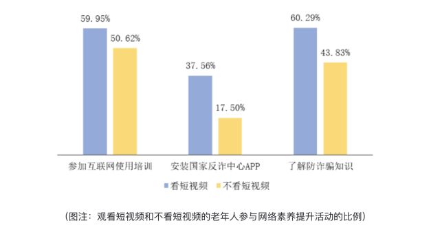 調查數據證實,適度使用短視頻對中老年人網絡素養提升確有積極作用。在互聯網使用熟練程度上,觀看短視頻的中老年人自評均分為6.38,高於不看短視頻的中老年人的均分5.10。與此同時,觀看短視頻的老年人比不看短視頻的老年人蔘與互聯網使用培訓、安裝國家反詐中心APP以及多渠道瞭解詐騙知識的比例更高,提升自身網絡素養的態度更積極。