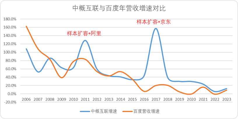 因此除了能夠在互聯網泡沫期殺出重圍外,實際是百度在很長時間內都沒能突破互聯網週期敍事。除了兩次樣本擴容的增量外,橫向對比百度和中概互聯近20年的營收增速,在2008年之後就基本沒能突破行業增長的上限。