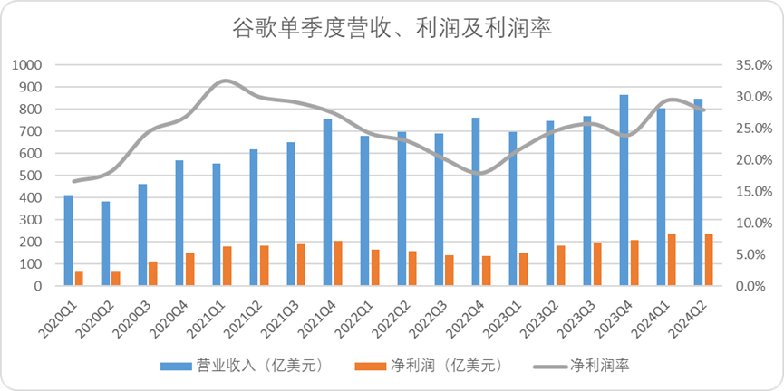 圖:谷歌單季度營收、利潤及利潤率,來源:企業財報,錦緞研究院整理