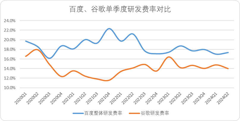 圖:百度、谷歌單季度研發費率對比,來源:企業財報,錦緞研究院整理