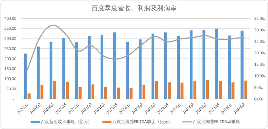 與此同時,百度利潤率維持在了相對高位,2024中報期經調整EBITDA利潤率達到了27%,較五年間低點增長了約14pct左右,自2022Q2以來維持了9個季度25%左右的利潤水平。