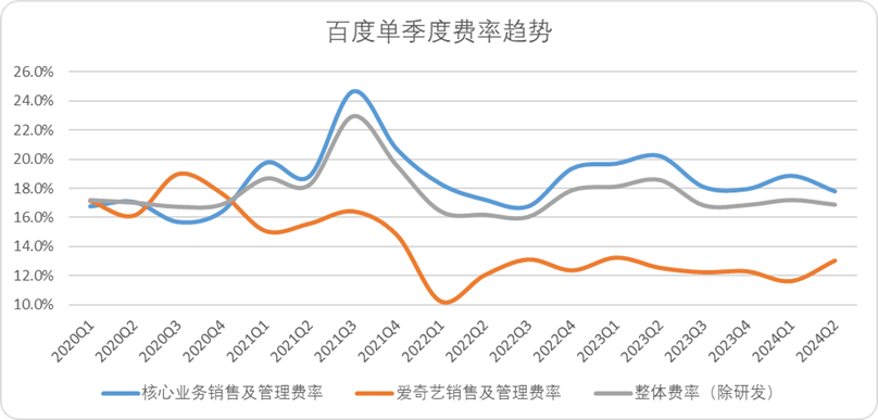 相比之下,雖然百度核心業務的費率也處於相對下降的態勢,但下降的幅度並不明顯。今年二季度同比銷售管理費用縮減11%,研發費用削減4%,整體的費率較去年同期下降5%。