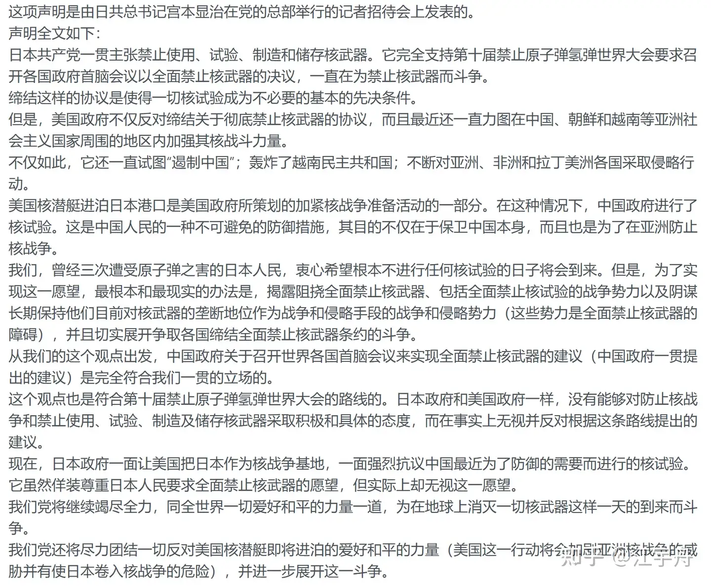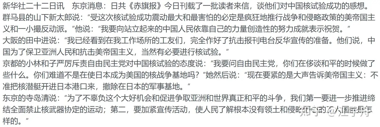 但與此同時,日本左翼對此表達了支持,部分團體還集會慶祝。日本共產黨中央委員會政治局十七日發表聲明指出,中國進行核試驗,其目的不僅在於保衞中國本身,而且是為了在亞洲防止核戰爭。聲明還表示支持中國政府關於召開世界各國首腦會議以實現全面禁止核武器的建議[[5]](https://www.zhihu.com/question/347437685/answer/6485749657)。