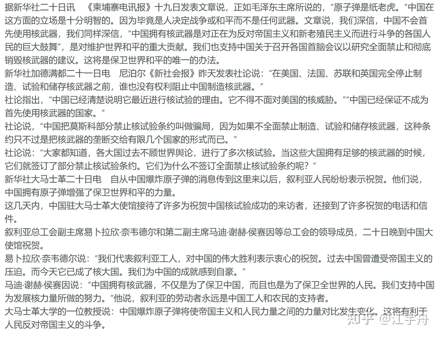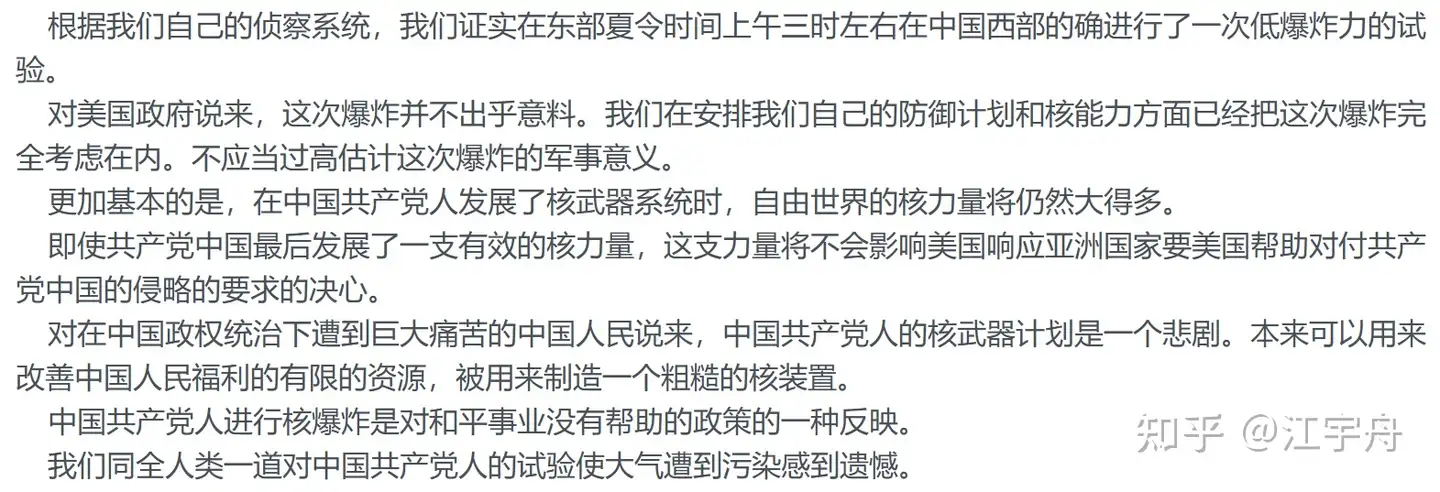 約翰遜聲明節選。順便説一句,英國政府和主要媒體的反應也與美國統一口徑,稱我國核試驗裝置原始、有彈無槍、不會改變世界軍事力量的對比,還要十幾年才能獲得載具,現在充其量是核俱樂部的“見習會員”。對於這類鸚鵡學舌,完全沒必要在正文給出專門的篇幅了。
