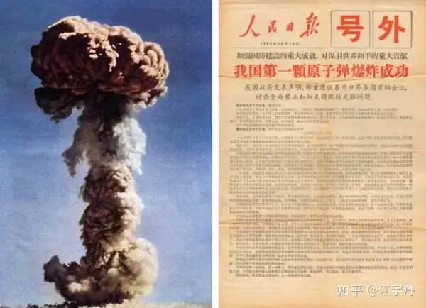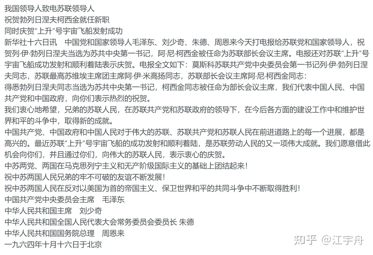 視線再轉回蘇聯這邊,中國原子彈爆炸2天前,赫魯曉夫下台,蘇共中央在16日原子彈爆炸當天發佈了將他解職的公報。第二天的《人民日報》上,將原子彈爆炸與我國黨政全套領導班子祝賀蘇聯新領導人就職和宇宙飛船發射成功的致電放在一起,襯托得氣氛相當熱烈[[17]](https://www.zhihu.com/question/347437685/answer/6485749657)。