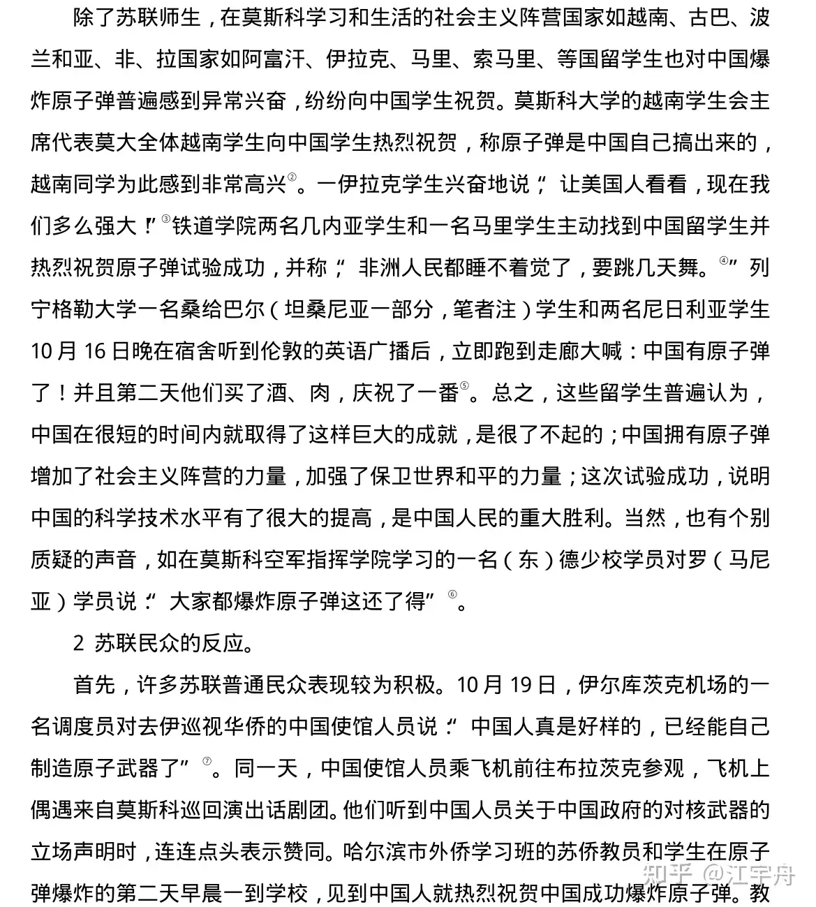 與官方的冷淡所不同的是,在這個階級感情尚存的年代,蘇聯民間多熱烈表達了對中國原子彈爆炸的祝賀,而且在蘇第三世界國家留學生們也紛紛向我方留學生祝賀。這是我們今天回顧時所不應忘卻的[[18]](https://www.zhihu.com/question/347437685/answer/6485749657)。