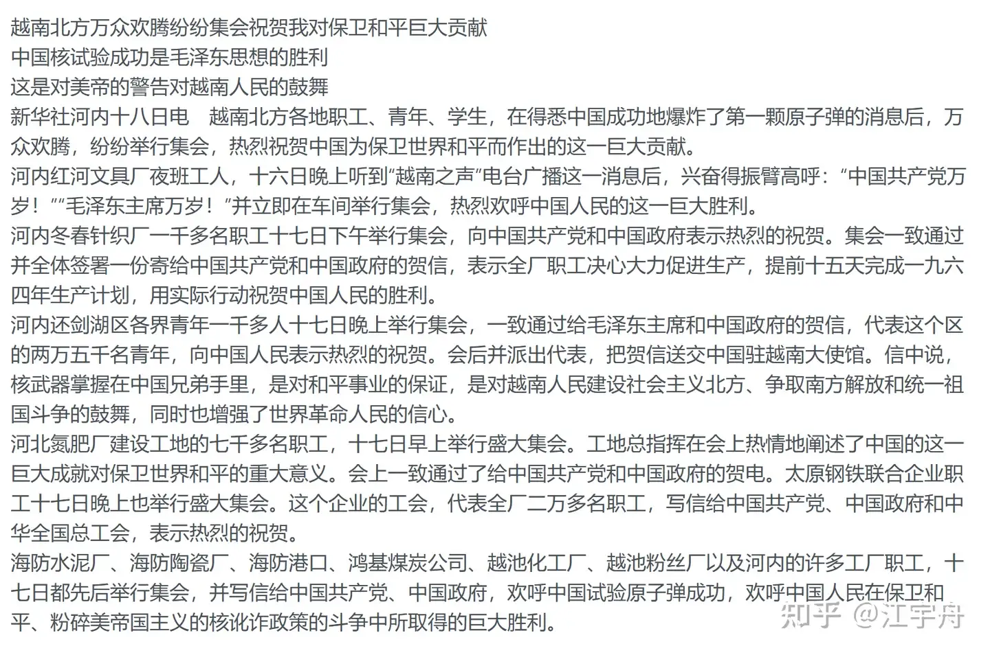 原子彈爆炸時候,正在抗美救國戰爭關鍵時期的越南,態度最為積極,不僅胡伯伯來電,長征、武元甲、黎友壽、孫德勝也分別致電祝賀,北方一些工廠和團體還組織集會慶賀[[2]](https://www.zhihu.com/question/347437685/answer/6485749657)。