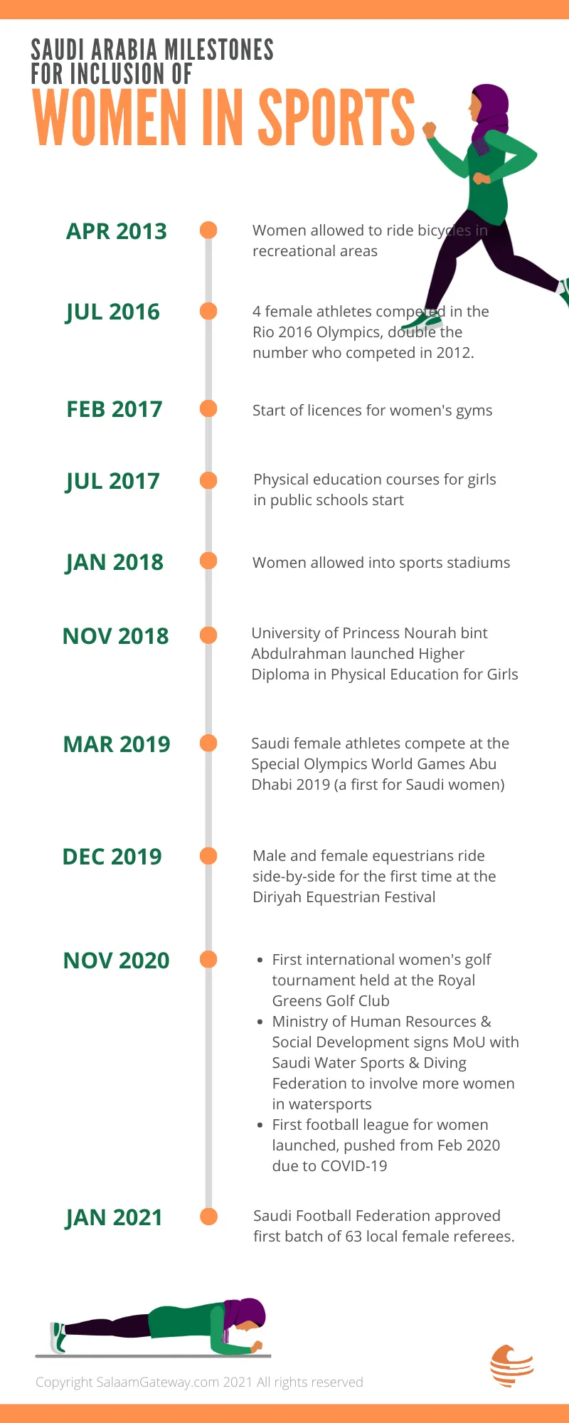 2012年倫敦奧運會,沙特派出女性運動員參賽,賽前需要穿戴符合教法,也要經家長同意。2018年,WWE在沙特舉辦,沙特女性運動員穿着包裹全身的服裝打比賽。2022年,沙特阿拉伯女子足球國家隊贏得首場國際比賽,同年12月,沙特申辦2026 年亞足聯女子亞洲盃。