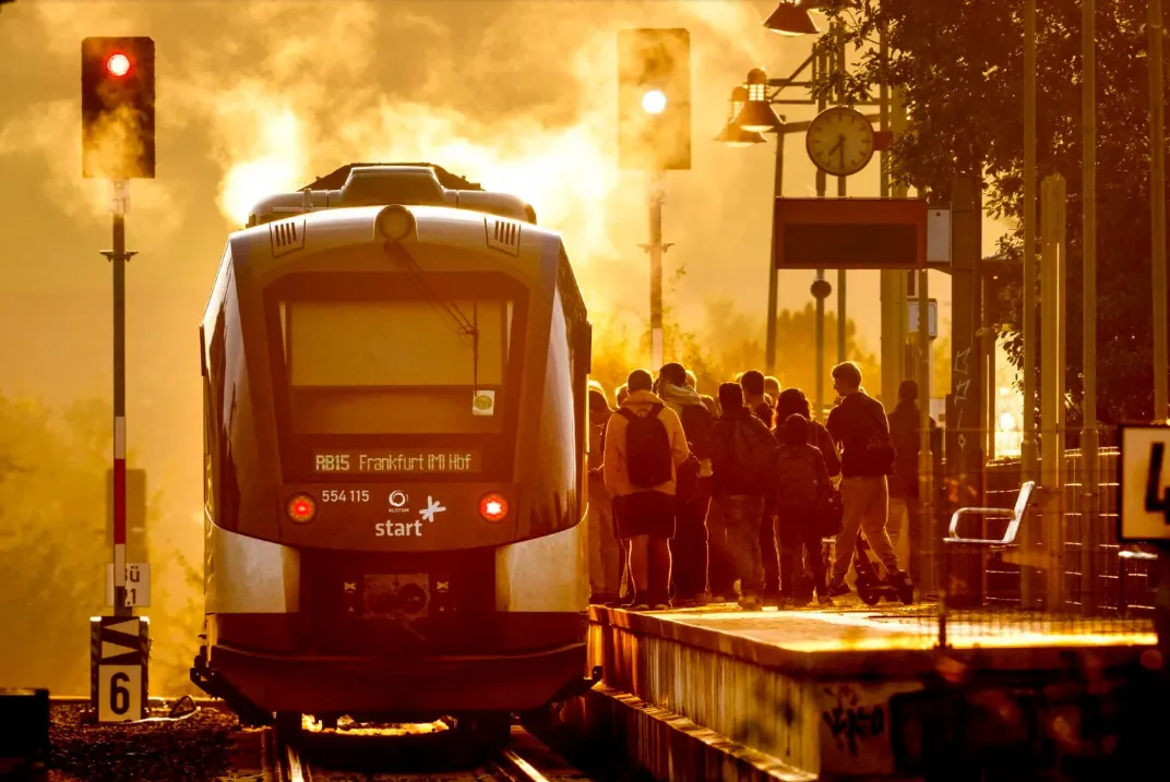 2024年9月10日,德國法蘭克福,上班人士在早上於韋爾海姆車站登上區域氫能列車。(圖源:美聯社)