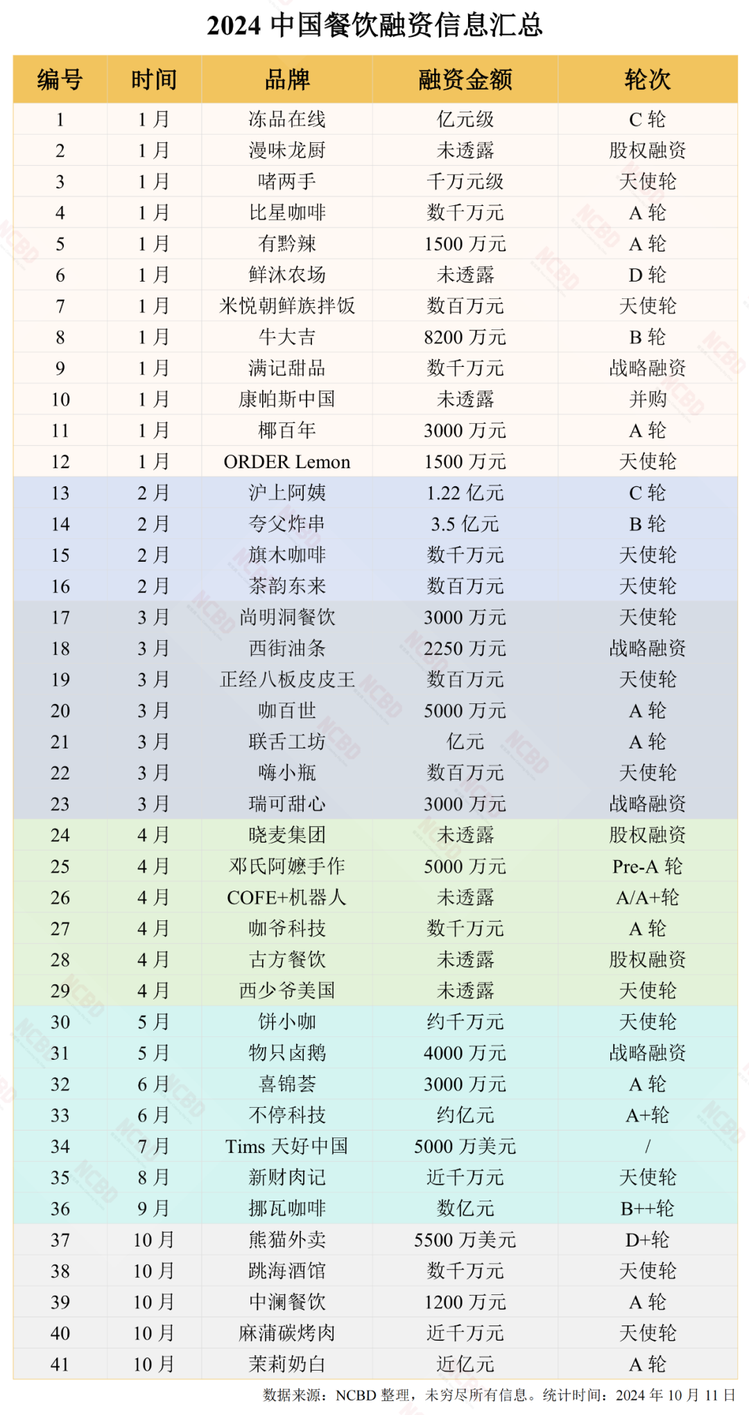 餐飲大數據研究與認證機構NCBD(餐寶典)對今年的餐飲融資信息作了一個大致的統計,刨除幾個不太正常的融資信息,截至10月11日,共有41家企業獲得融資。