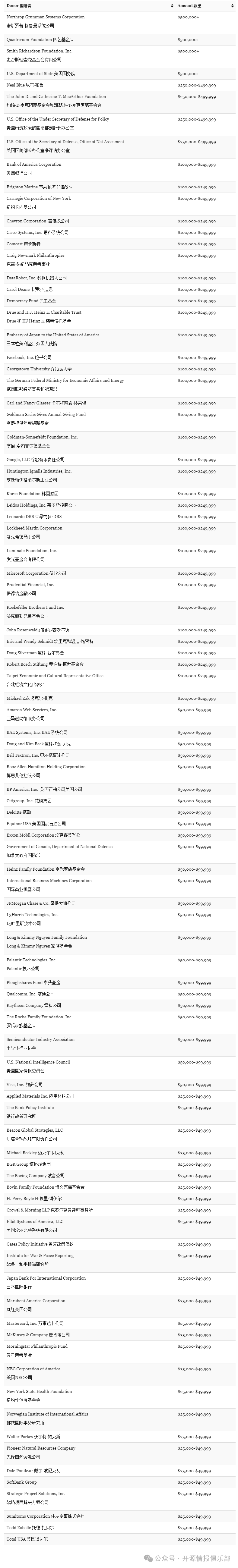 根據CNAS的2020財年報告,CNAS的2020年收入:11,033,683美元。根據其報告文件,捐贈金額在25萬美元以上的94家團隊組織名單(名單如下圖)説明:捐贈金額設置了檔位,如捐贈了30萬美元,則歸於“25萬-49.9萬美元”檔位。
