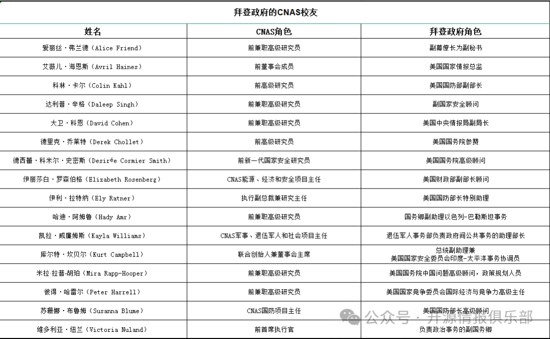 下列表中列出了迄今為止被選為拜登政府外交政策和國家安全決策職位的至少16名CNAS校友。