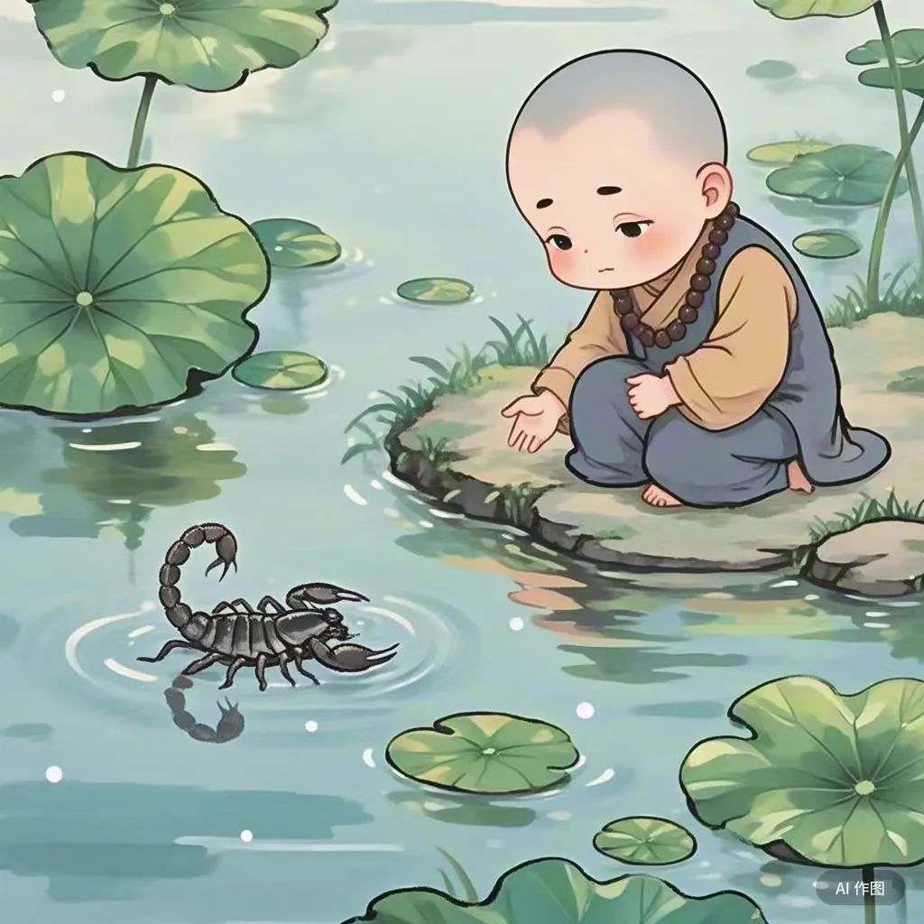 小和尚疼得一哆嗦,蠍子又掉水裏了,眼看又要淹死。