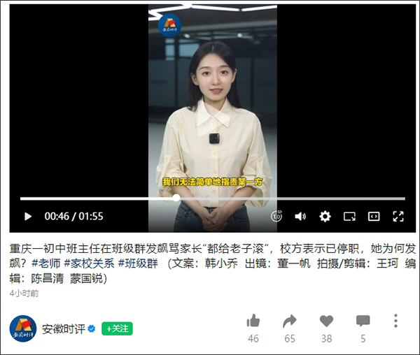 安徽日報報業集團旗下視頻號“安徽時評”16日發佈視頻稱,涉事班主任在和家長溝通過程中,不斷説出“想告就去告”“跟你同歸於盡”“我已經爆炸了”這樣的狠話,如此驚人的言辭,是一時情緒失控、個人反應過激,還是積壓已久的矛盾爆發,家長們到底説了什麼,她又經歷了什麼,背後是否有着更深層的教育困境,這些疑問不解決,我們無法簡單地指責某一方。