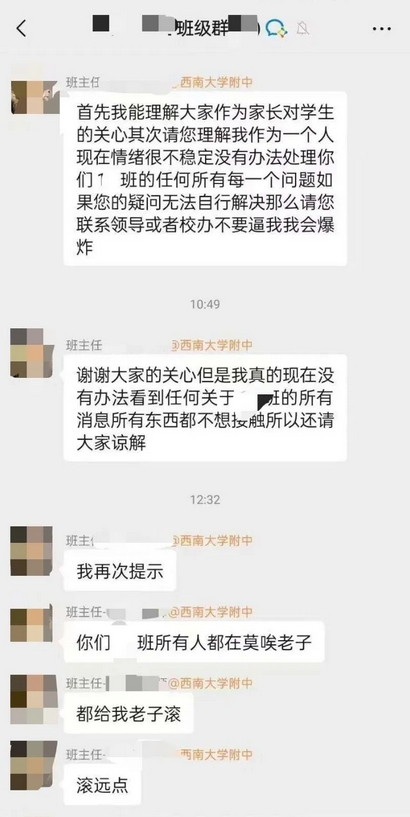 10月14日,重慶西南大學附屬中學班主任徐某某疑似情緒激動,在班級羣怒罵“都給老子滾”,相關聊天記錄在社交平台傳播後,迅速引起輿論關注。不少網友將矛頭直指涉事班主任。涉事班主任所在的中學公開回應稱,目前已經暫停了徐某某的教育教學工作,後續將根據調查情況進一步處理。