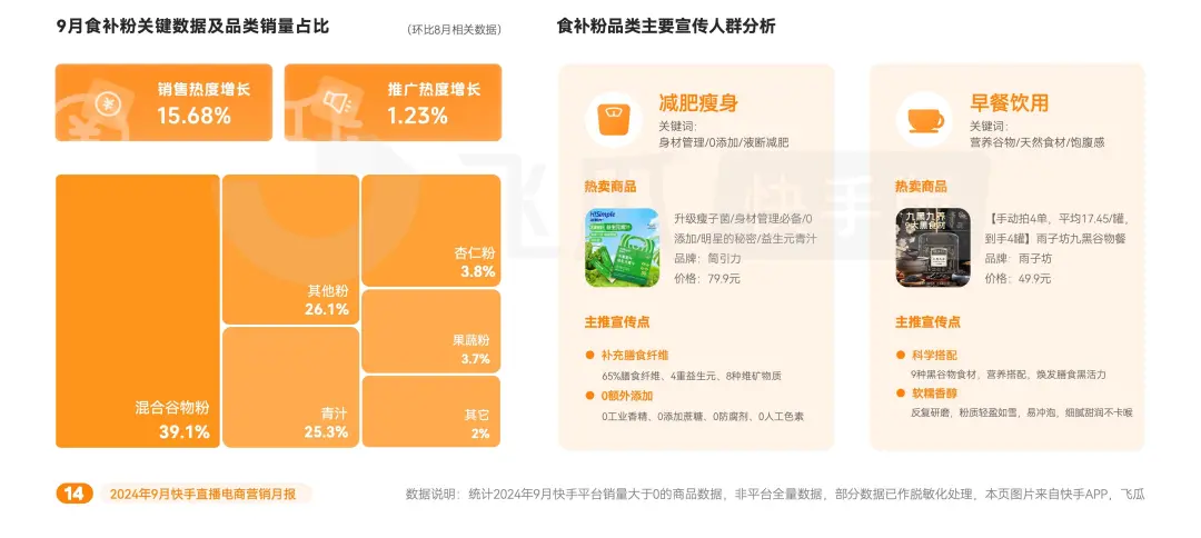 在種草方面,品牌商家將食補粉與健康生活深度綁定,強調宣傳賣點來精準觸達人羣。別特是針對那些尋求補充膳食纖維、追求0添加以輔助減肥瘦身的羣體,以及重視科學搭配、將其作為早餐選擇的消費者羣體。