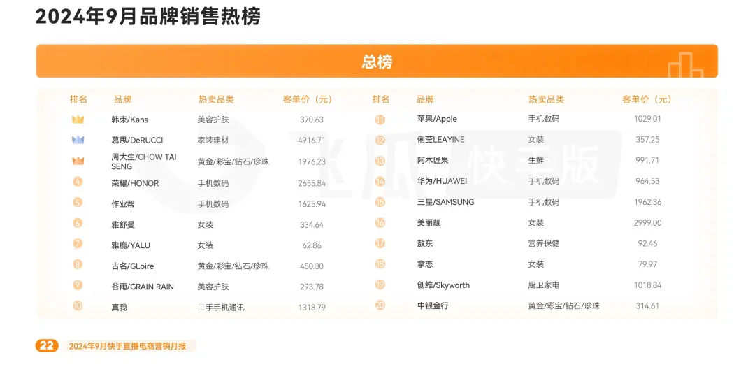 最後,報告整合了2024年9月品牌銷售總榜TOP20,以及女裝、男裝、美容護膚、美妝、內衣/家居服/襪子、休閒食品、飲料衝調、糧油調味、鐘錶各行業的品牌銷售榜單。